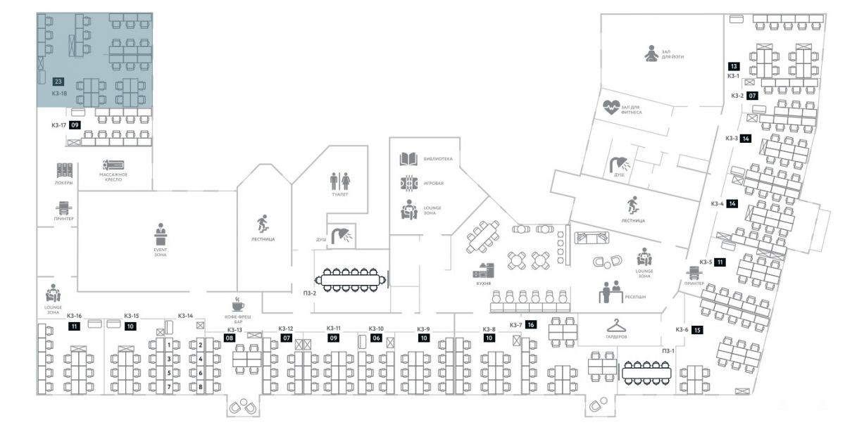 • Доступ к кухне, тренажерному залу, залу для йоги, игровой и event-зоне.