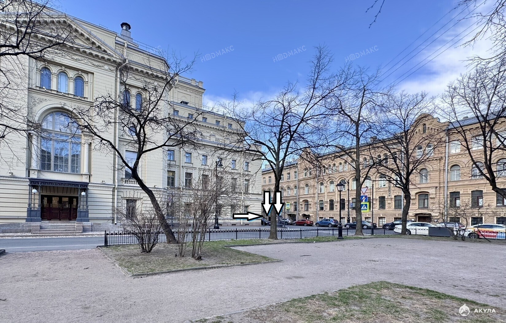 Вход с Театральной площади, все окна выходят на консерваторию имени Н.А. Римского-Корсакова. Рядом расположены Мариинский театр, музей искусства Санкт-Петербурга и Никольский сад.