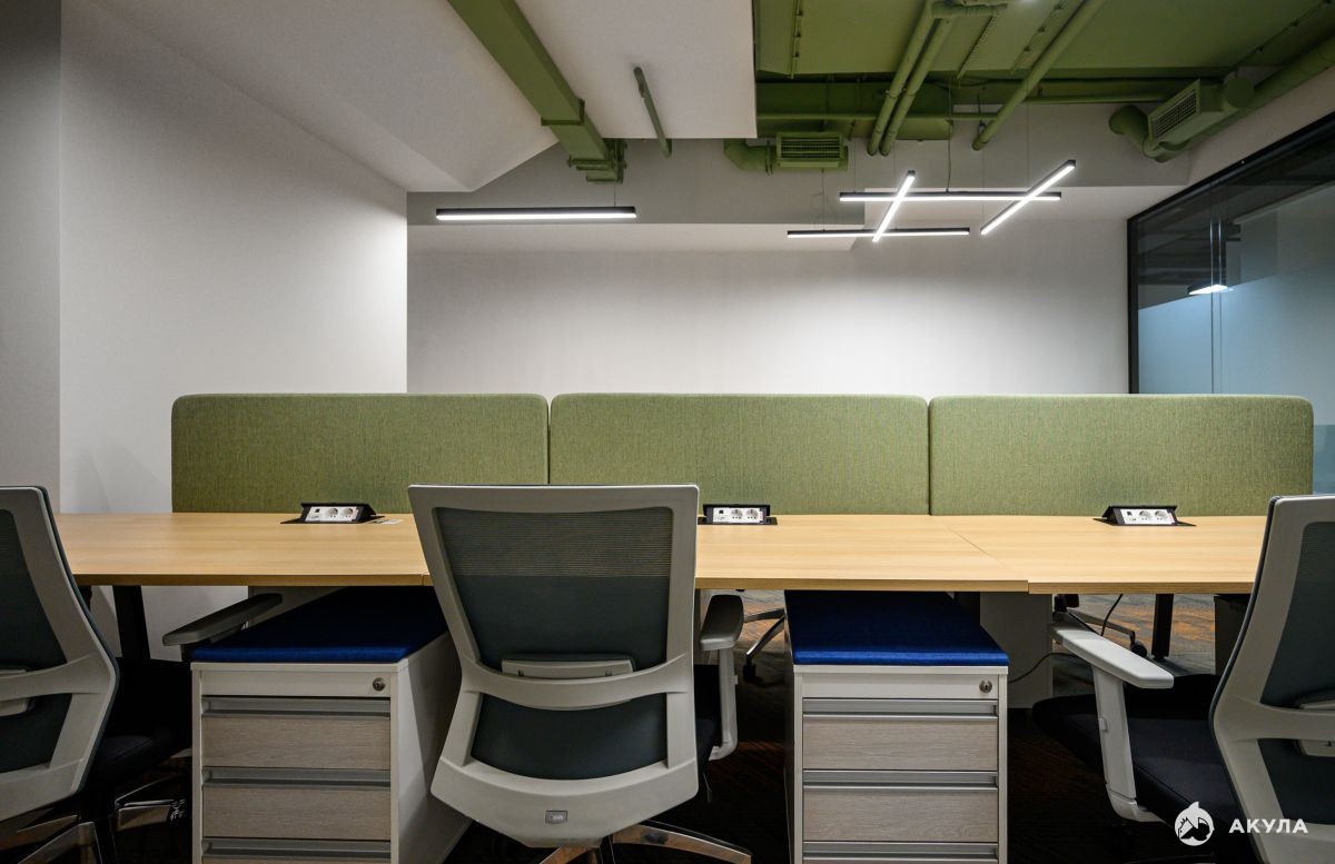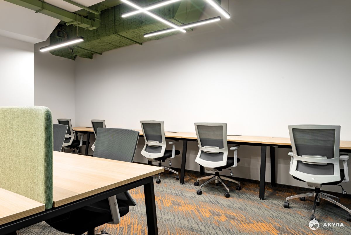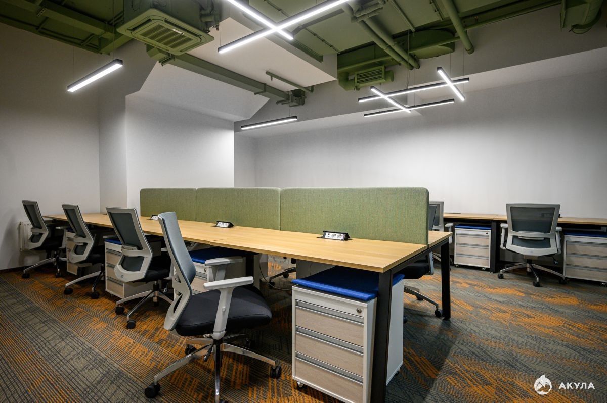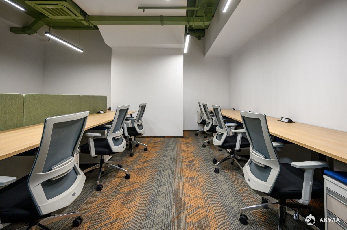 - Полное мебельное оснащение - рабочие столы с электро-подключением и СКС, эргономичные рабочие кресла,