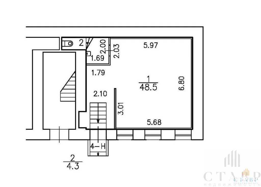 Общая площадь 53 кв.м. Общая зона - 48, 5 кв.м. С/у - 4, 3 кв.м. Высота потолка - 3 метра.