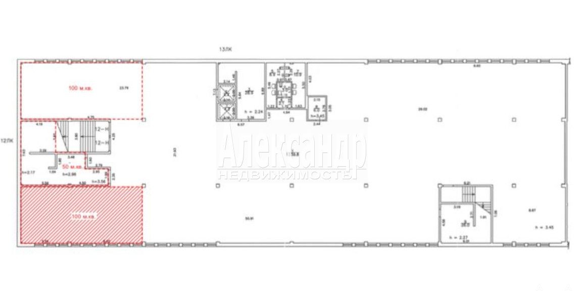 Окна вдоль периметра помещения со стороны Комендантского пр., под потолком.