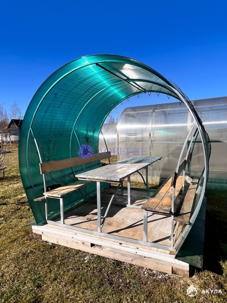 Для выращивания растений предусмотрены две теплицы из поликарбоната, а также просторные приподнятые грядки. Участок огорожен сеткой.