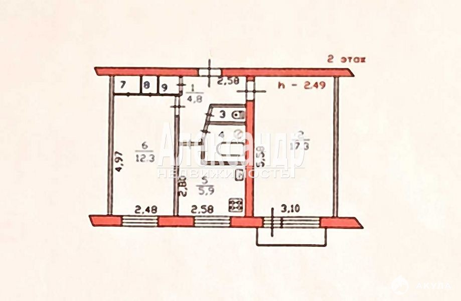 Общая площадь квартиры 44, 65 кв.м, кухня 5, 9 кв.м, комнаты изолированные 17, 3 кв.м и 12, 3 кв.м, санузел раздельный, балкон.