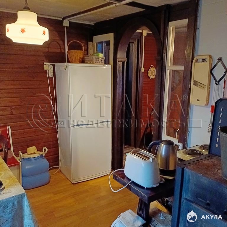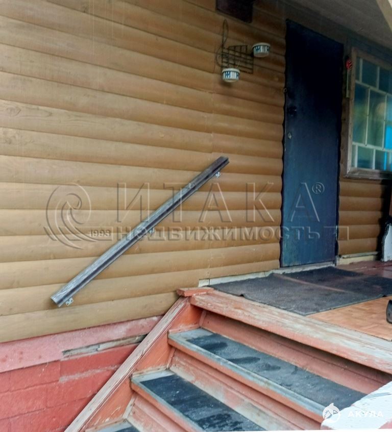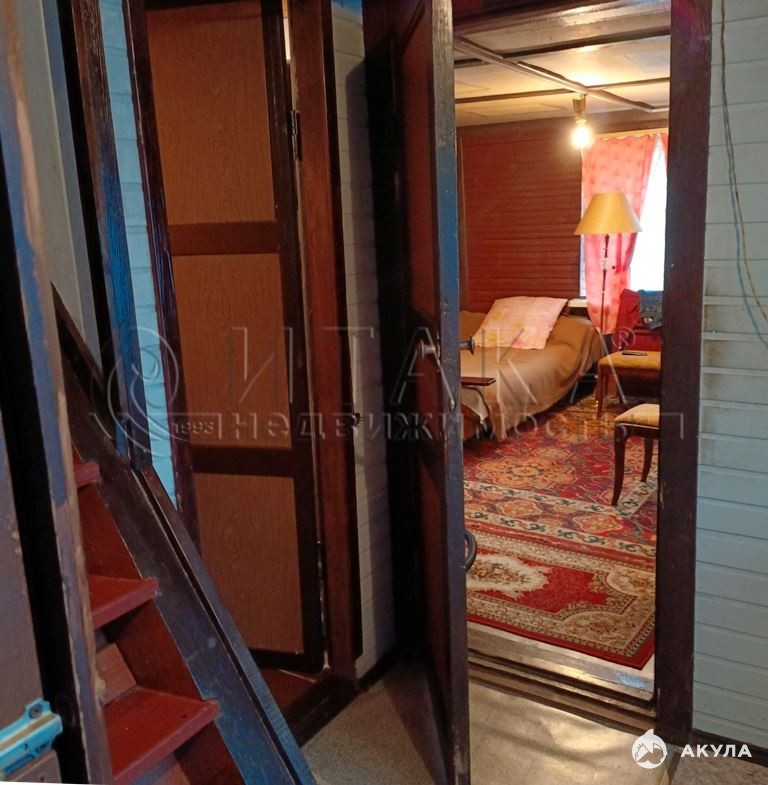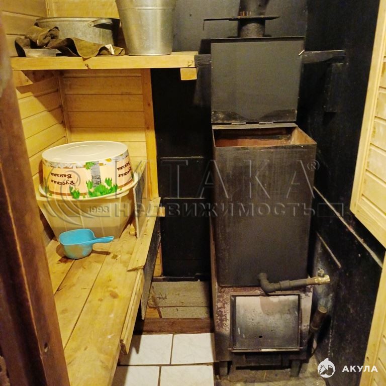 Первый этаж - кухня-гостиная, комната, небольшая сауна (пол бетонный со сливом), отопление печное; стены - брус (обшиты блок-хаусом), внутренняя отделка - вагонка.