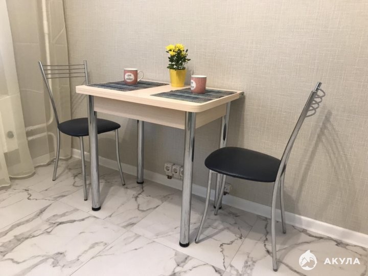 Полностью оборудованная кухня: холодильник, плита с 4 конфорками, духовка, микроволновка, электрический чайник, небольшой набор посуды.