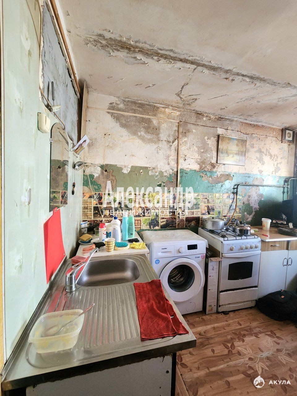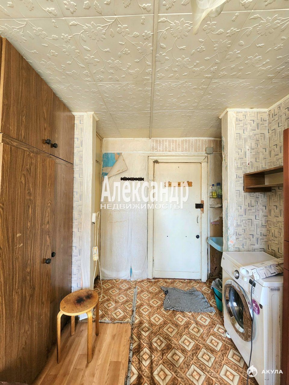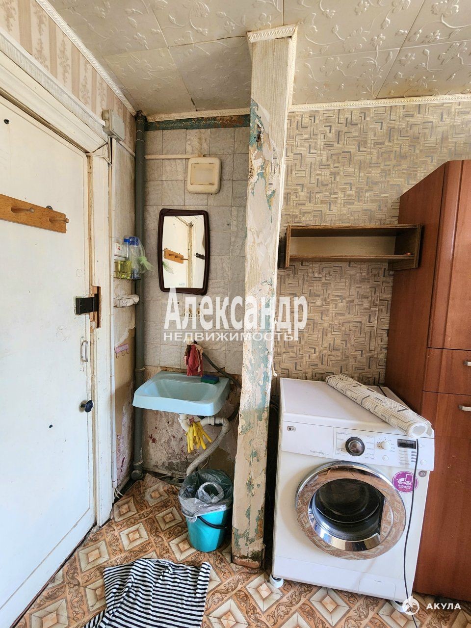 В комнате останется мебель, подключена стиральная машинка, в комнате также находится мокрая точка, установлена раковина.