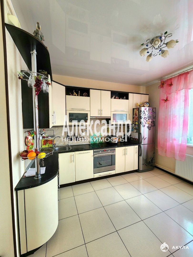 Кухня площадью 12, 7 кв. м, из неё выход на балкон, плюс от застройщика сделана арка между комнатой и кухней, получается кухня-гостиная, остаётся кухонный гарнитур.