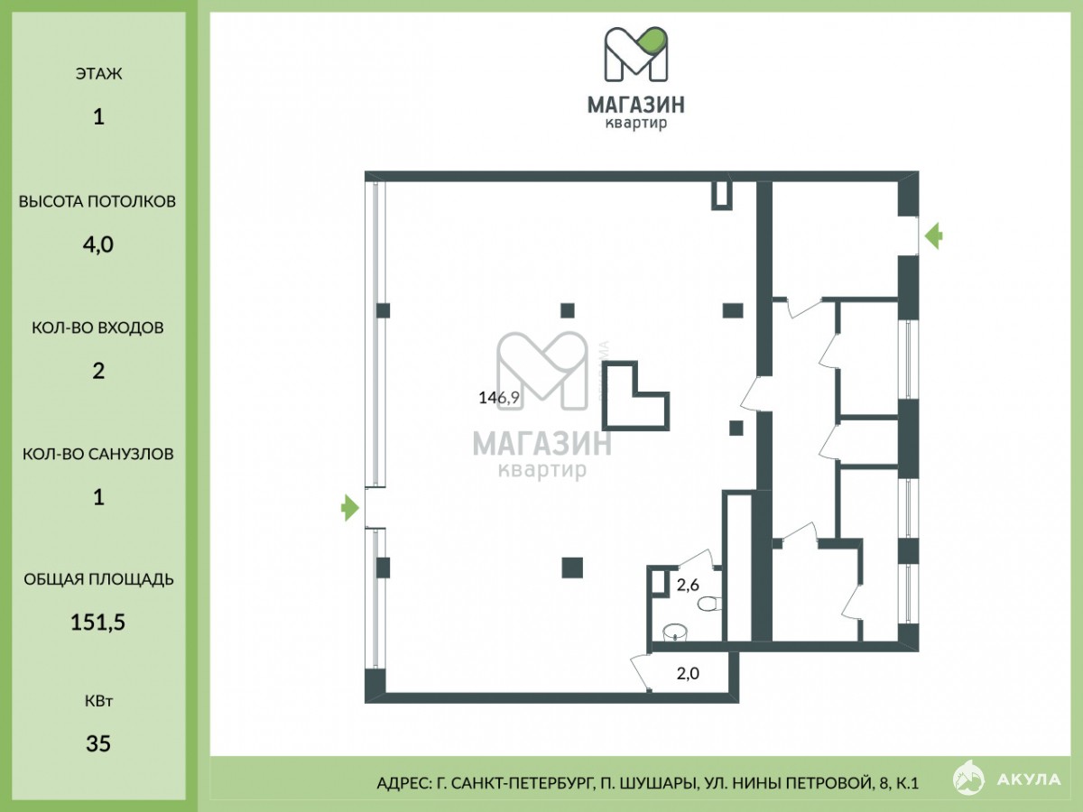 Помещение расположено на самой главной улице данного жилого комплекса, который рассчитан на 35 тысяч жителей.