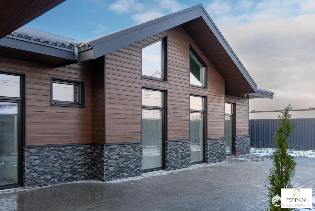 Из гостиной открывается панорамный вид, который меняется вместе с сезонами, наполняя интерьер природным светом и особенной атмосферой. Просторная крытая терраса расширяет границы дома — здесь можно устроить обед на свежем воздухе, зону отдыха или уединённый уголок.