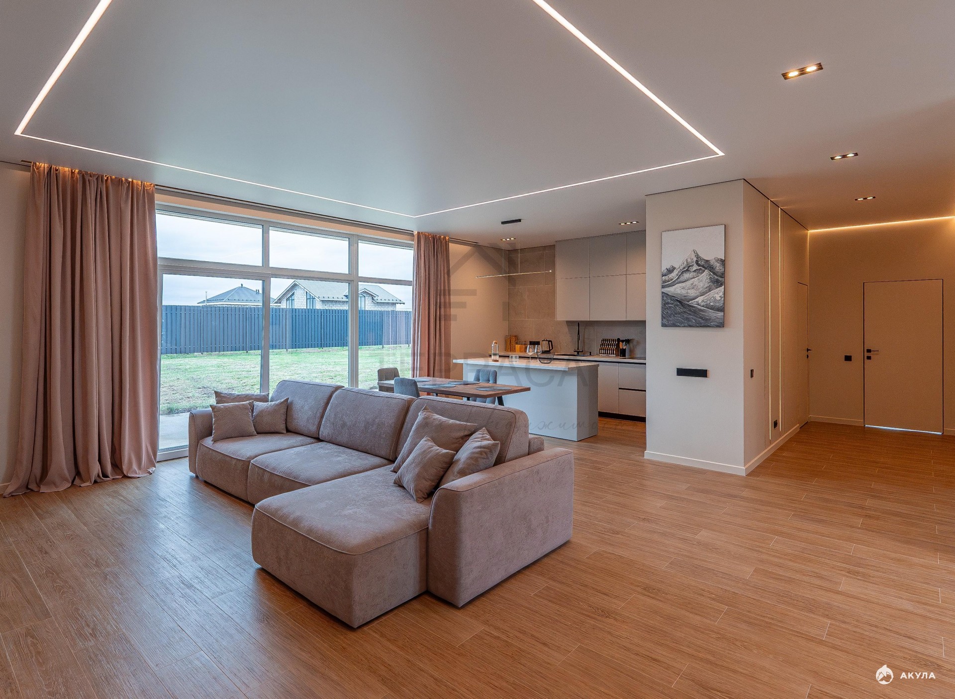 Из гостиной открывается панорамный вид, который меняется вместе с сезонами, наполняя интерьер природным светом и особенной атмосферой. Просторная крытая терраса расширяет границы дома — здесь можно устроить обед на свежем воздухе, зону отдыха или уединённый уголок.