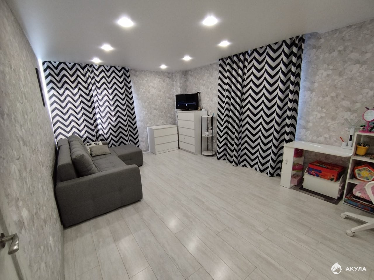 Стильные детали — скрытые карнизы с подсветкой, два окна в комнате для зонирования на гостиную и спальню (есть закладная для установки перегородки).