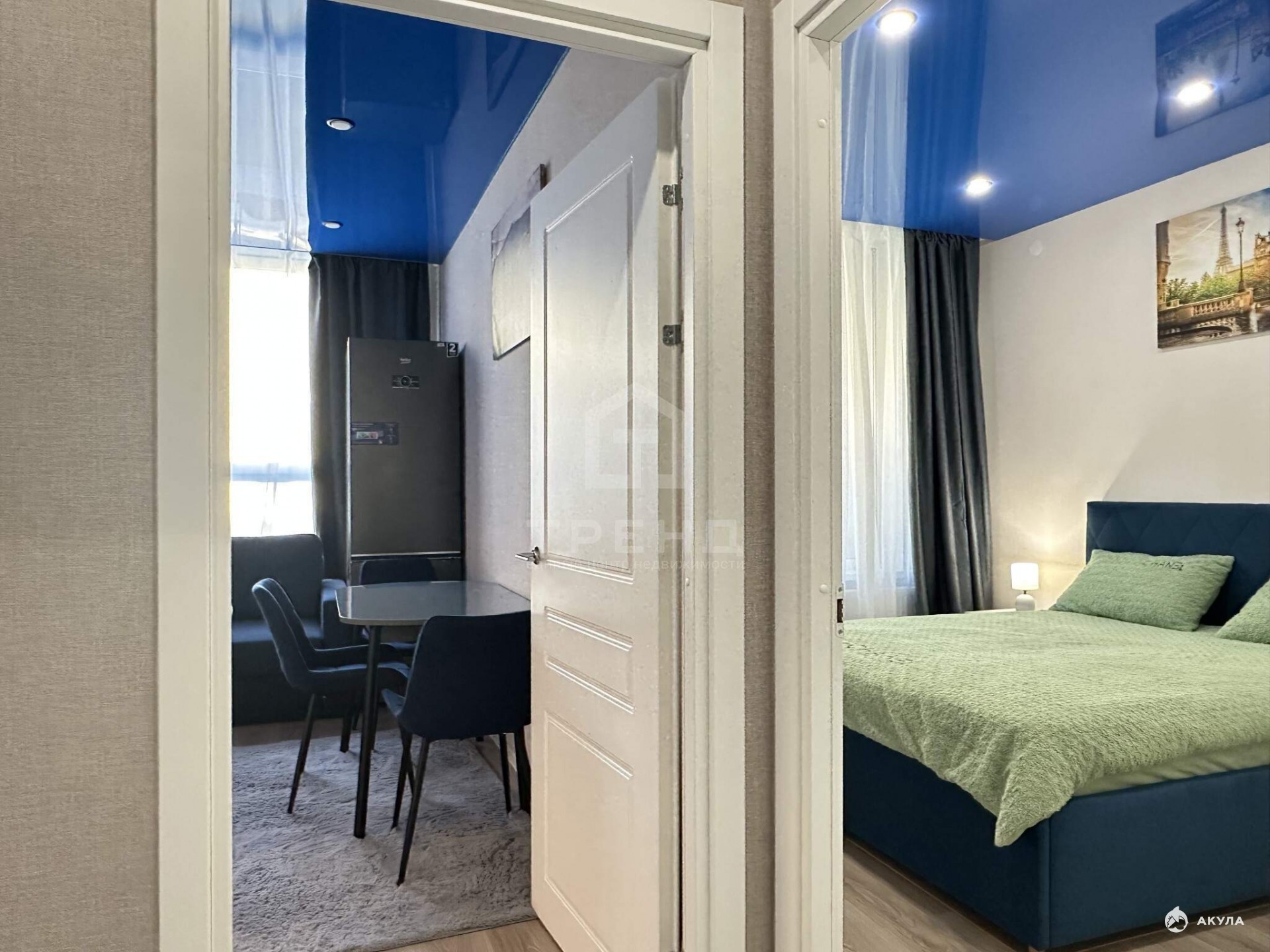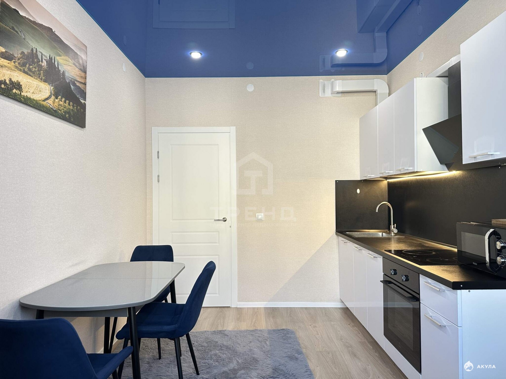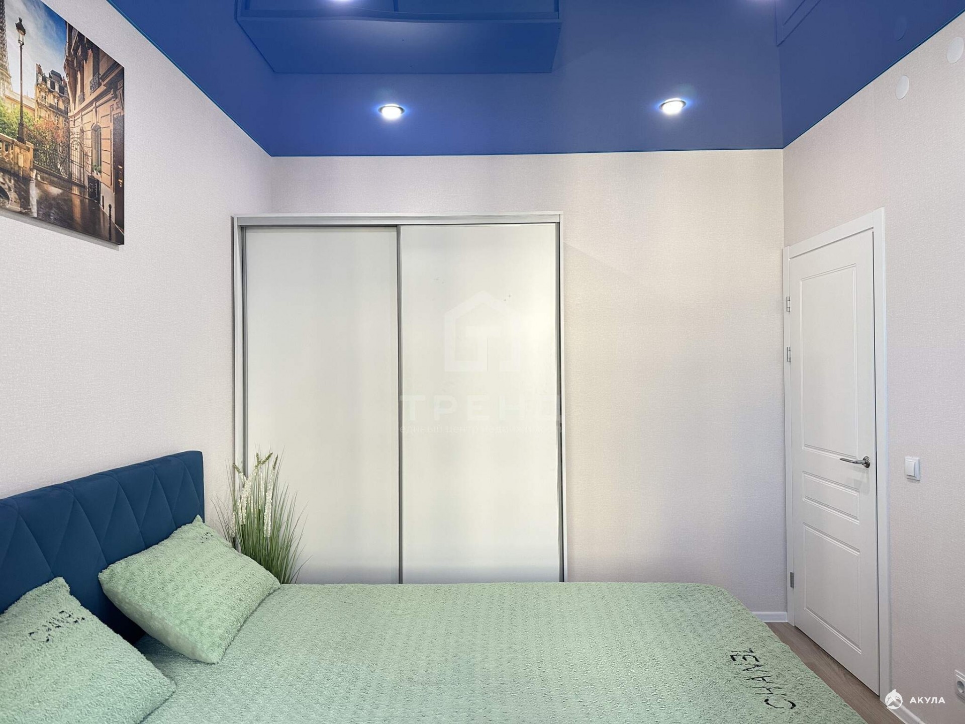 Дизайнерский ремонт - продуманный интерьер с натяжными потолками глубокого синего цвета. Этот оттенок создаёт расслабляющую атмосферу и добавляет интерьеру изысканности: вы будете быстрее расслабляться после рабочего дня и лучше высыпаться.