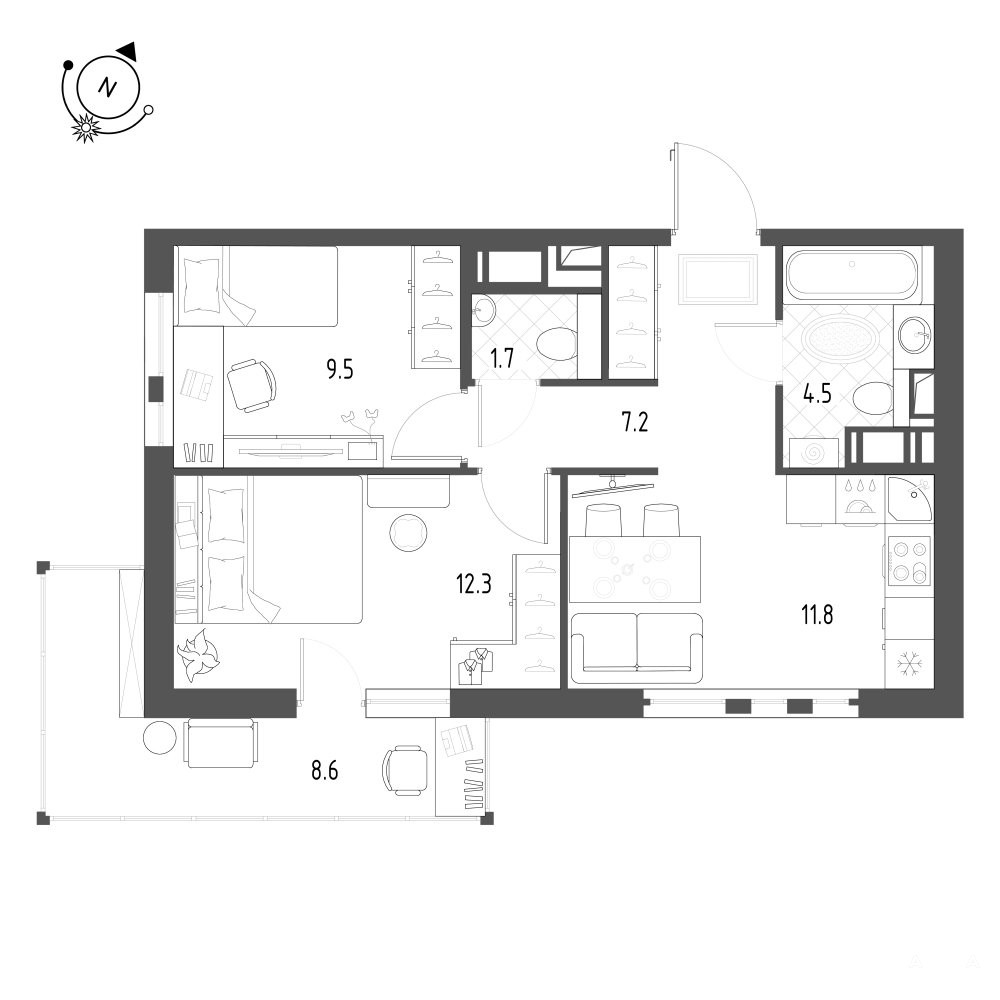 Комнаты 9, 5м2+12, 3 м2