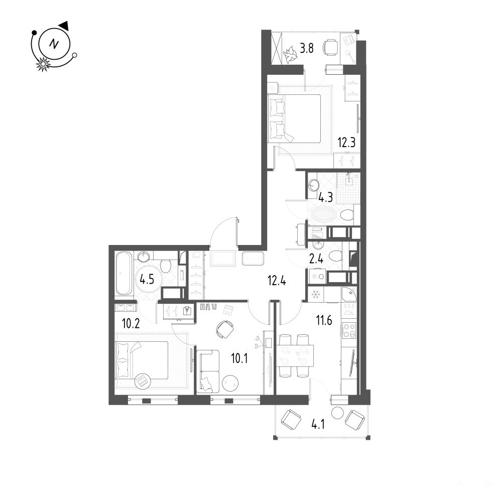№344291 Продается уютная 3 х комнатная квартира ( 4Е) , где полноценные 3 комнаты + кухня-гостинная, в современном жилом комплексе ЖК Монография . 70, 9 м2