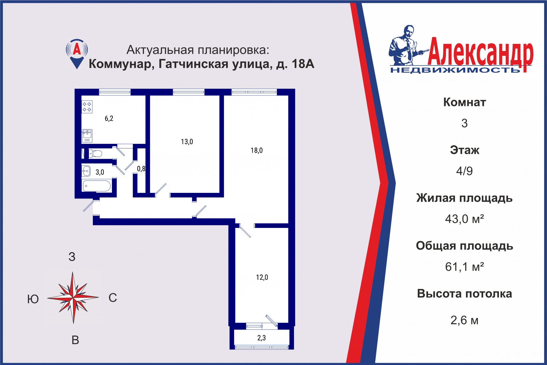 1703217 Прoдaетcя 3х-комнатная квартиpа, расположенная в центре небольшого и зелёного города Коммунар в Ленинградской области.