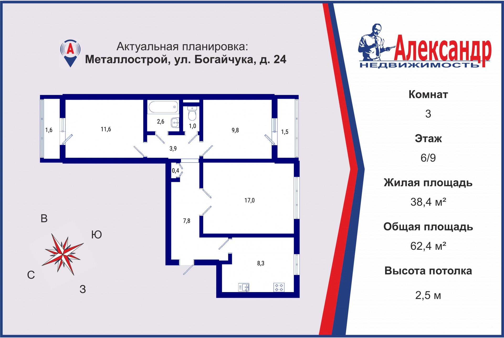 1700724 В продаже светлая, просторная трехкомнатная квартира.