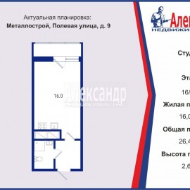 1706219 В продаже большая, уютная студия 26, 4 кв.м с приличным ремонтом, большой застекленной лоджией, с прекрасным видом, т.к. этаж 16 из 17-ти и перед окнами никаких, равных по высоте строений, воздух всегда свежий. Квартира теплая, светлая, установлены новые современные двери,...