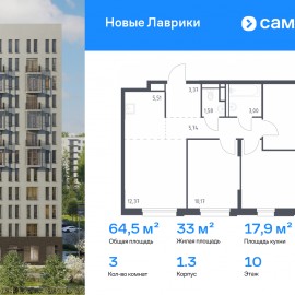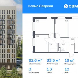 Строим кварталы для жизни с заботой о будущем. Предлагается 3-комнатная квартира комфорт-класса 62, 55 кв.м в корпусе 1.3 на 10 этаже, в ЖК «Новые Лаврики» Квартира с предчистовой отделкой. Доступность дополнительных опций уточняйте у застройщика. Приобрести квартиру возможно...