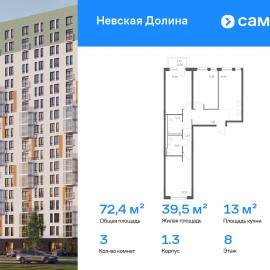 Строим кварталы для жизни с заботой о будущем. Предлагается 3-комнатная квартира комфорт-класса 72, 41 кв.м в корпусе 1.3 на 8 этаже, в ЖК «Невская Долина» Квартира с чистовой отделкой. Доступность дополнительных опций уточняйте у застройщика. Приобрести квартиру возможно по...