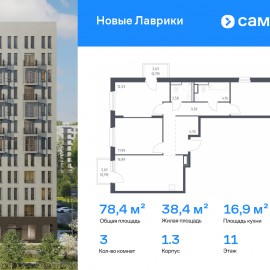 Строим кварталы для жизни с заботой о будущем. Предлагается 3-комнатная квартира комфорт-класса 78, 36 кв.м в корпусе 1.3 на 11 этаже, в ЖК «Новые Лаврики» Квартира с чистовой отделкой. Доступность дополнительных опций уточняйте у застройщика. Приобрести квартиру возможно по...