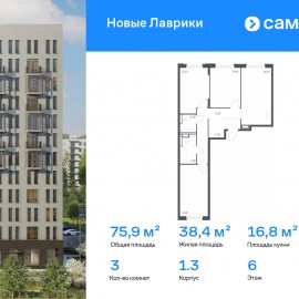 Строим кварталы для жизни с заботой о будущем. Предлагается 3-комнатная квартира комфорт-класса 75, 93 кв.м в корпусе 1.3 на 6 этаже, в ЖК «Новые Лаврики» Квартира с предчистовой отделкой. Доступность дополнительных опций уточняйте у застройщика. Приобрести квартиру возможно...