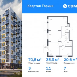 Строим кварталы для жизни с заботой о будущем. Предлагается 3-комнатная квартира комфорт-класса 70, 54 кв.м в корпусе 1.1 на 7 этаже, в ЖК «Квартал Торики» Квартира с предчистовой отделкой. Доступность дополнительных опций уточняйте у застройщика. Приобрести квартиру возможно...