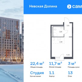 Строим кварталы для жизни с заботой о будущем. Предлагается квартира студия комфорт-класса 22, 38 кв.м в корпусе 1.1 на 13 этаже, в ЖК «Невская Долина» Квартира с чистовой отделкой. Доступность дополнительных опций уточняйте у застройщика. Приобрести квартиру возможно по...