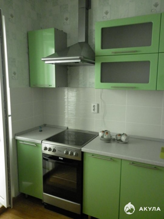 Полностью оборудованная кухня: холодильник, плита с 4 конфорками, духовка, микроволновка, электрический чайник, небольшой набор посуды.