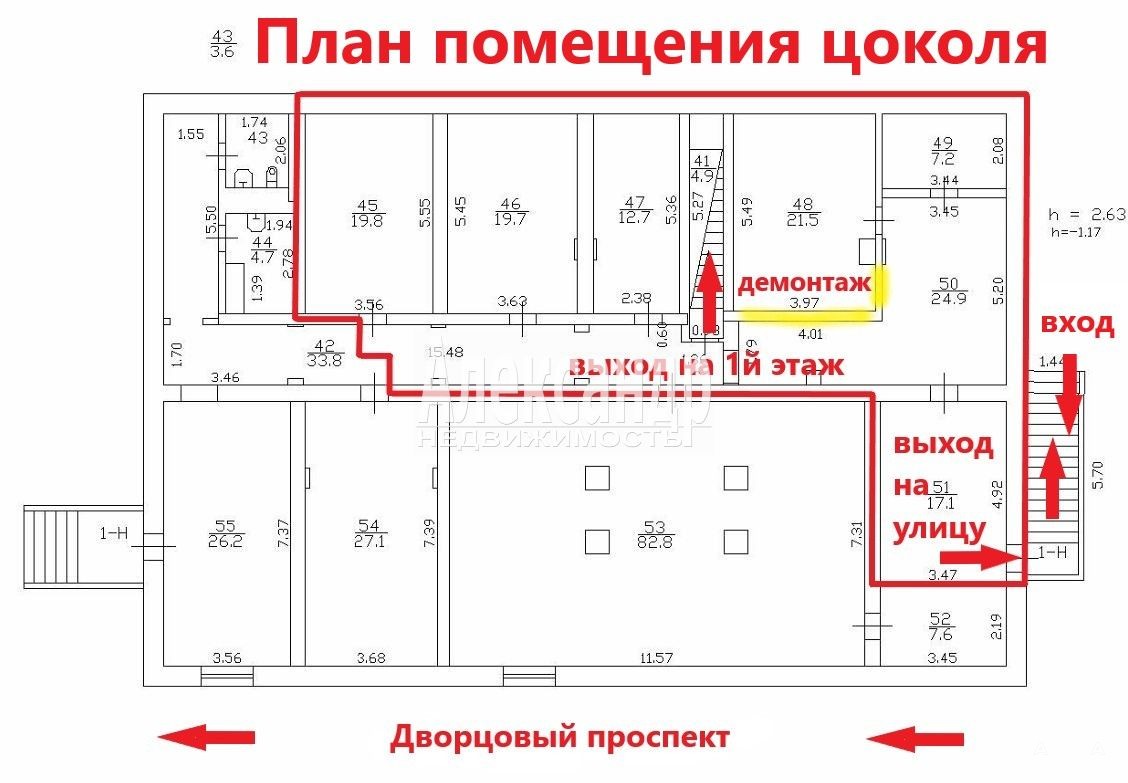 Высота потолков: 3.5 м на 1 этаже, 2, 63м в цоколе;