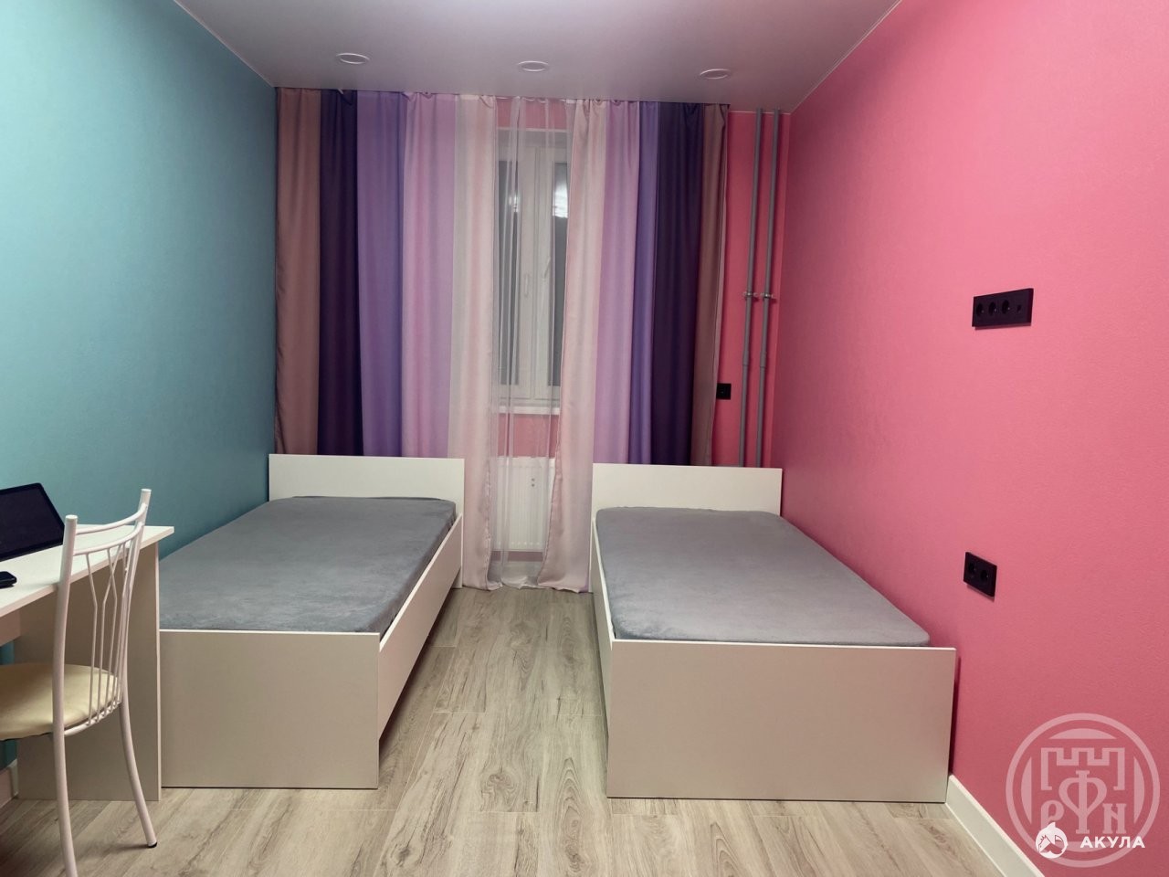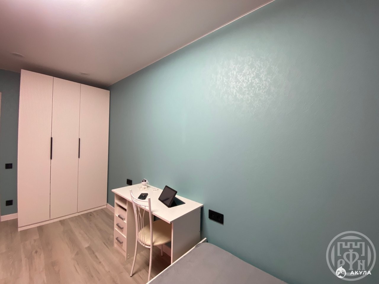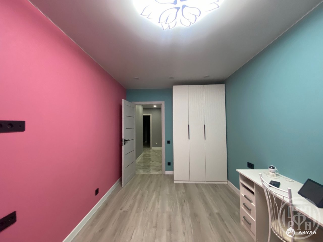 напольное покрытие: ламинат 33‑го класса в жилых помещениях и керамогранит на кухне и в прихожей;