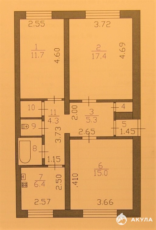 Изолированные комнаты - 17, 4 кв.м, 15 кв.м, 11, 7 кв.м.