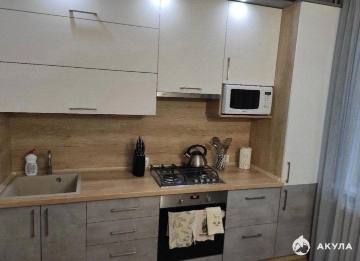 Полностью оборудованная кухня: холодильник, плита с 4 конфорками, духовка, микроволновка, электрический чайник, небольшой набор посуды.