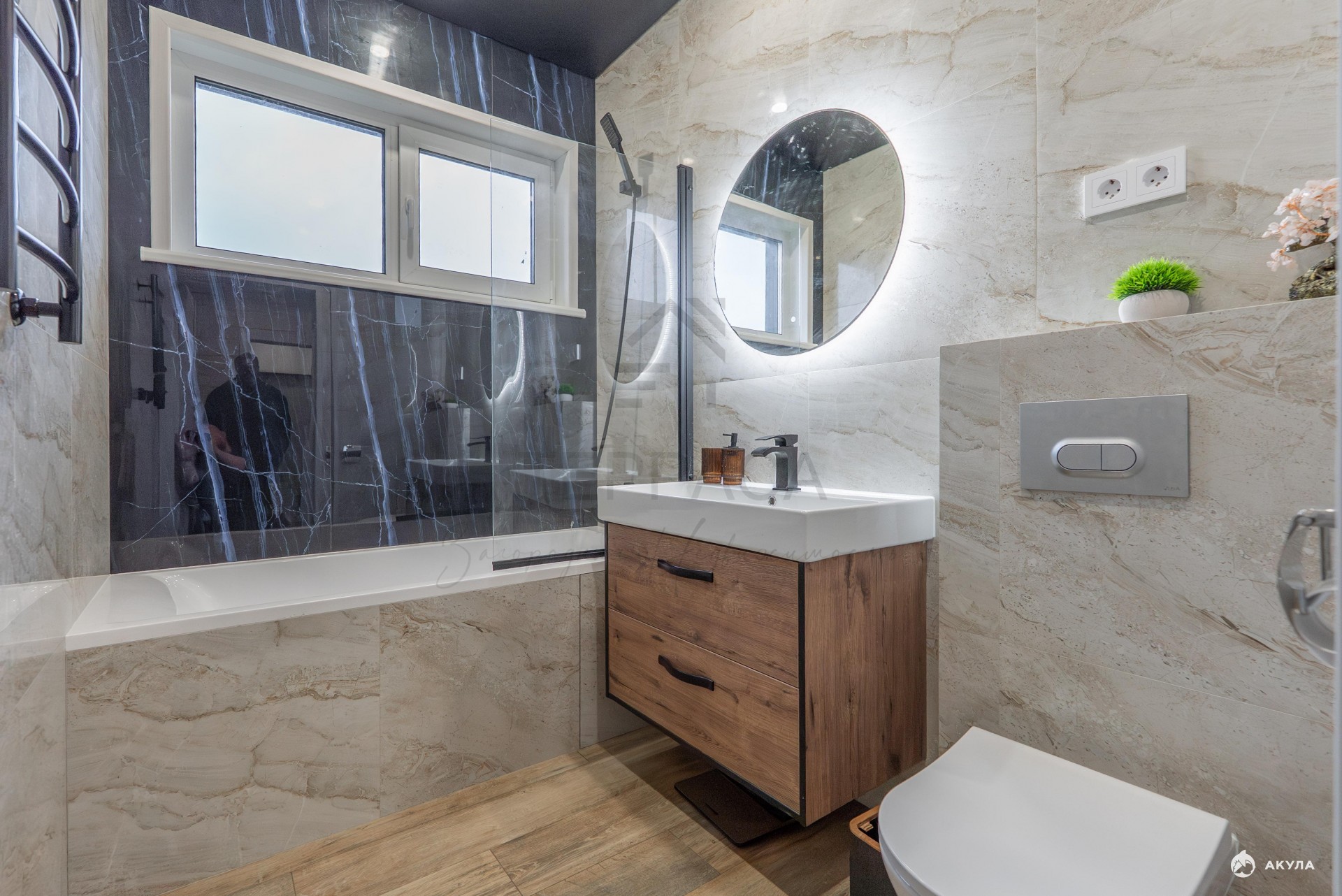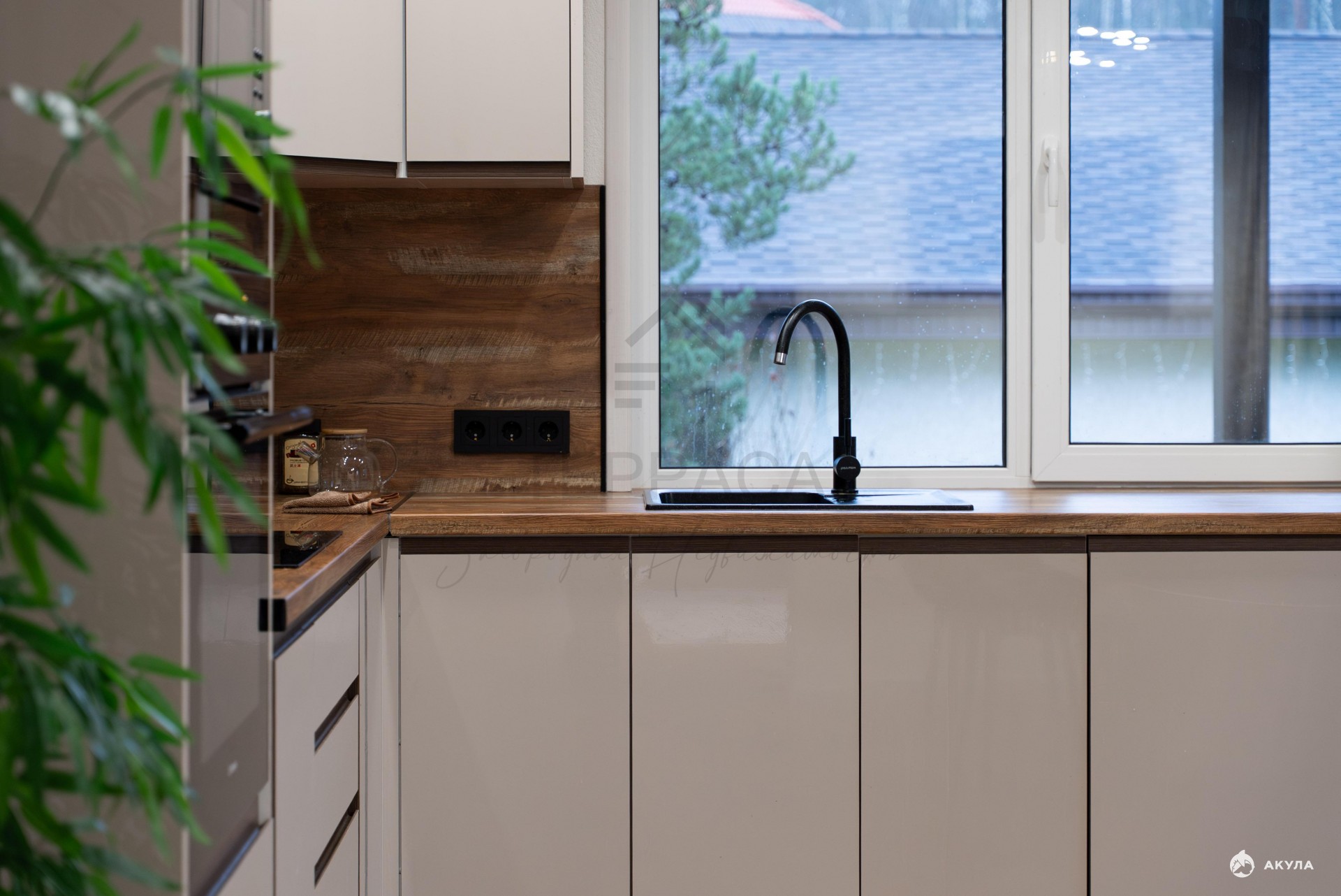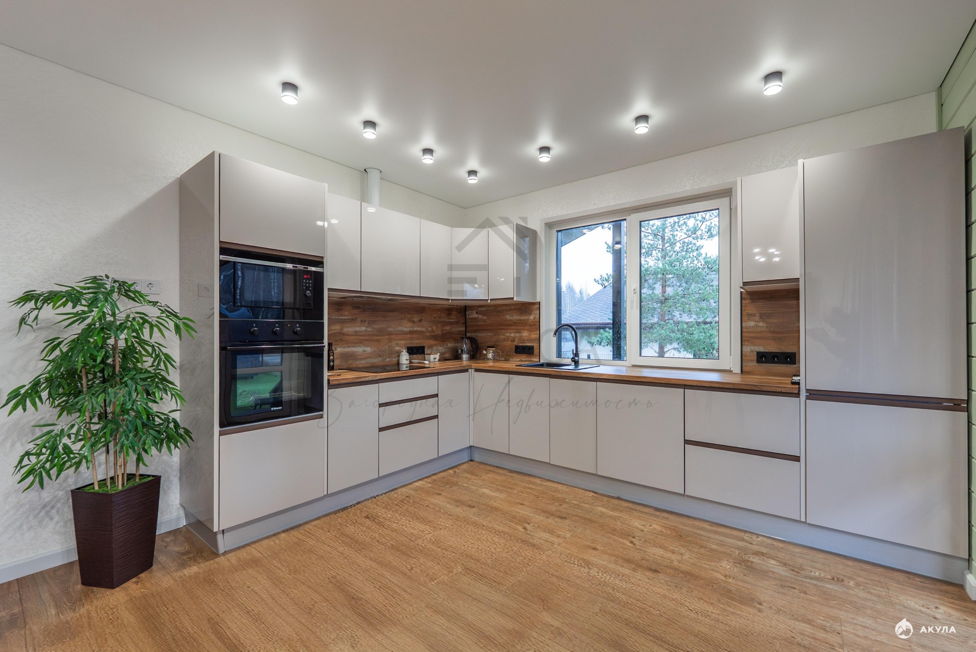 Дизайнерский ремонт выполнен с использованием безопасных экологически чистых материалов. Интерьер в спокойных тонах гармонично сочетается со стенами из натурального дерева и декоративной штукатуркой. Многоуровневое освещение с регулировкой яркости, дорогой ламинат, немецкая сантехника и ванна из литьевого мрамора — каждая деталь подчёркивает высокий статус дома.