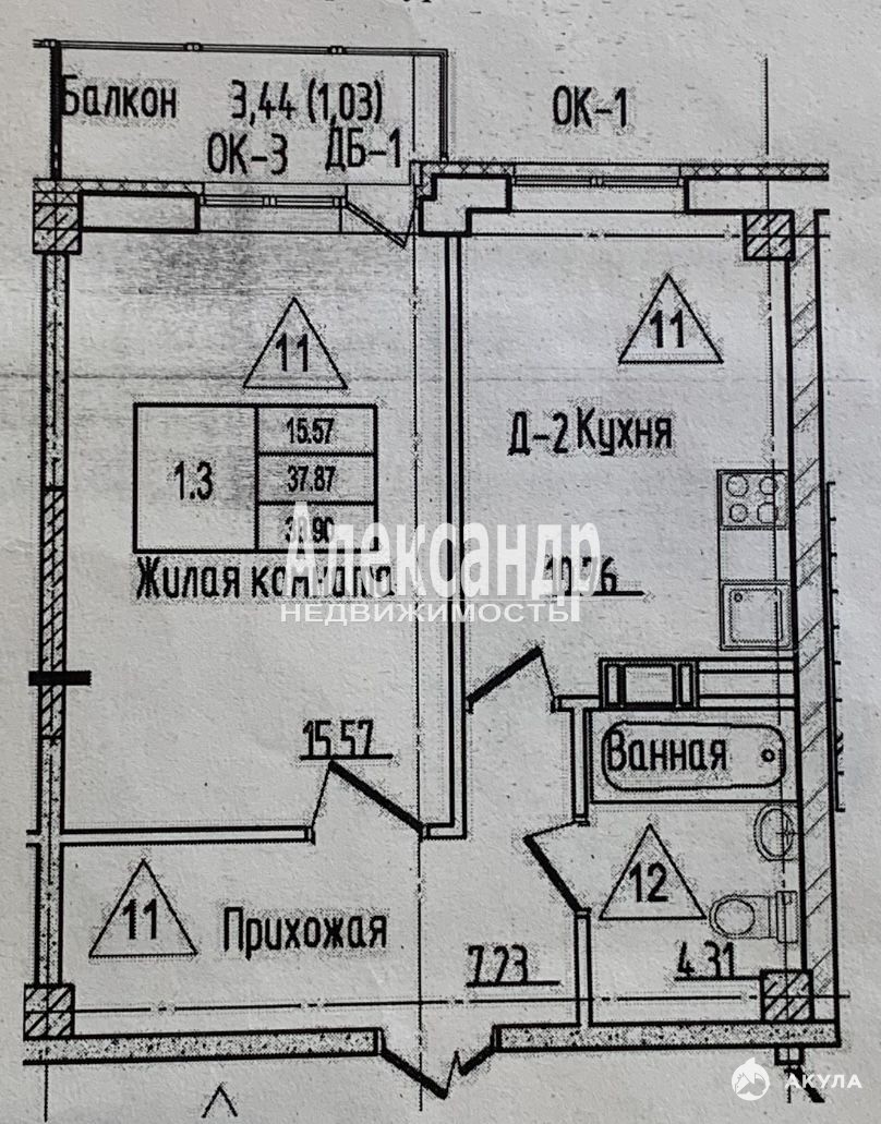По площади: комната 15, 5 кв.м., кухня 10.5, прихожая 7 кв.м., ванная 4, 3 кв.м., балкон 3.4 м., по выписке ЕГРН 38 кв.м, по факту с балконом больше 40кв.м.