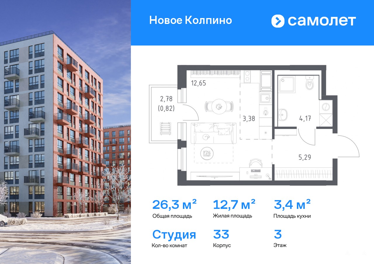 Строим кварталы для жизни с заботой о будущем. Предлагается квартира студия комфорт-класса 26, 31 кв.м в корпусе 33 на 3 этаже, в ЖК «Новое Колпино»