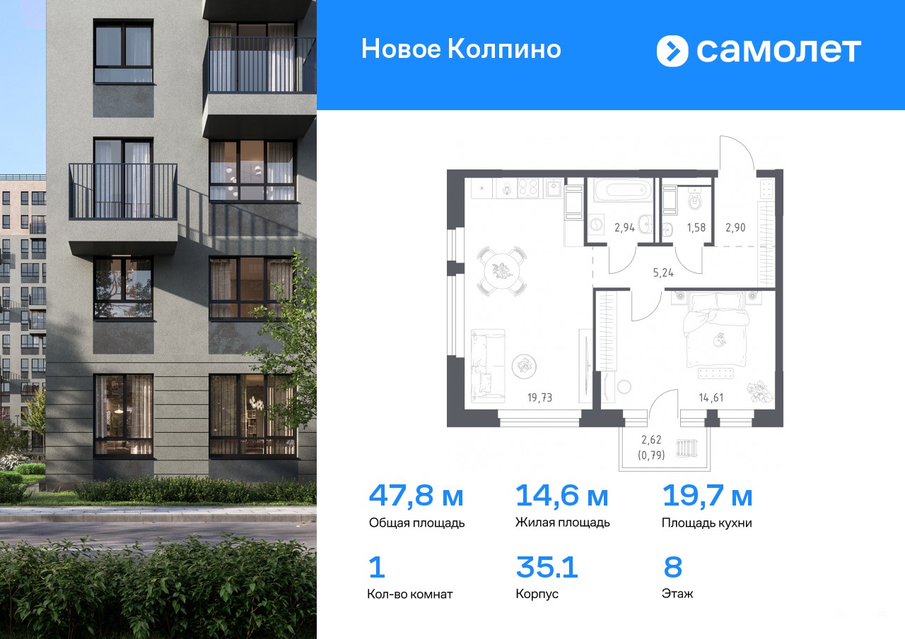 Строим кварталы для жизни с заботой о будущем. Предлагается 1-комнатная квартира комфорт-класса 47, 79 кв.м в корпусе 35.1 на 8 этаже, в ЖК «Новое Колпино»
