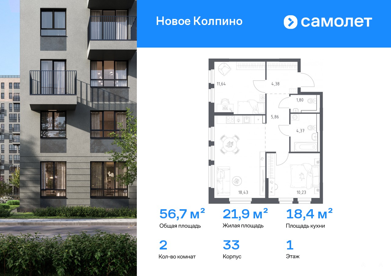 Предлагается 2-комнатная квартира комфорт-класса 56, 71 кв.м в корпусе 33 на 1 этаже, в ЖК «Новое Колпино»