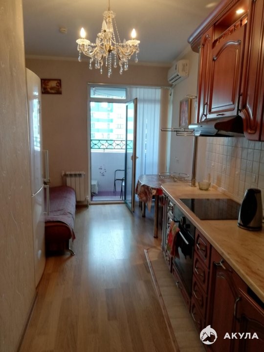 Полностью оборудованная кухня: холодильник, плита с 4 конфорками, духовка, микроволновка, электрический чайник, небольшой набор посуды.