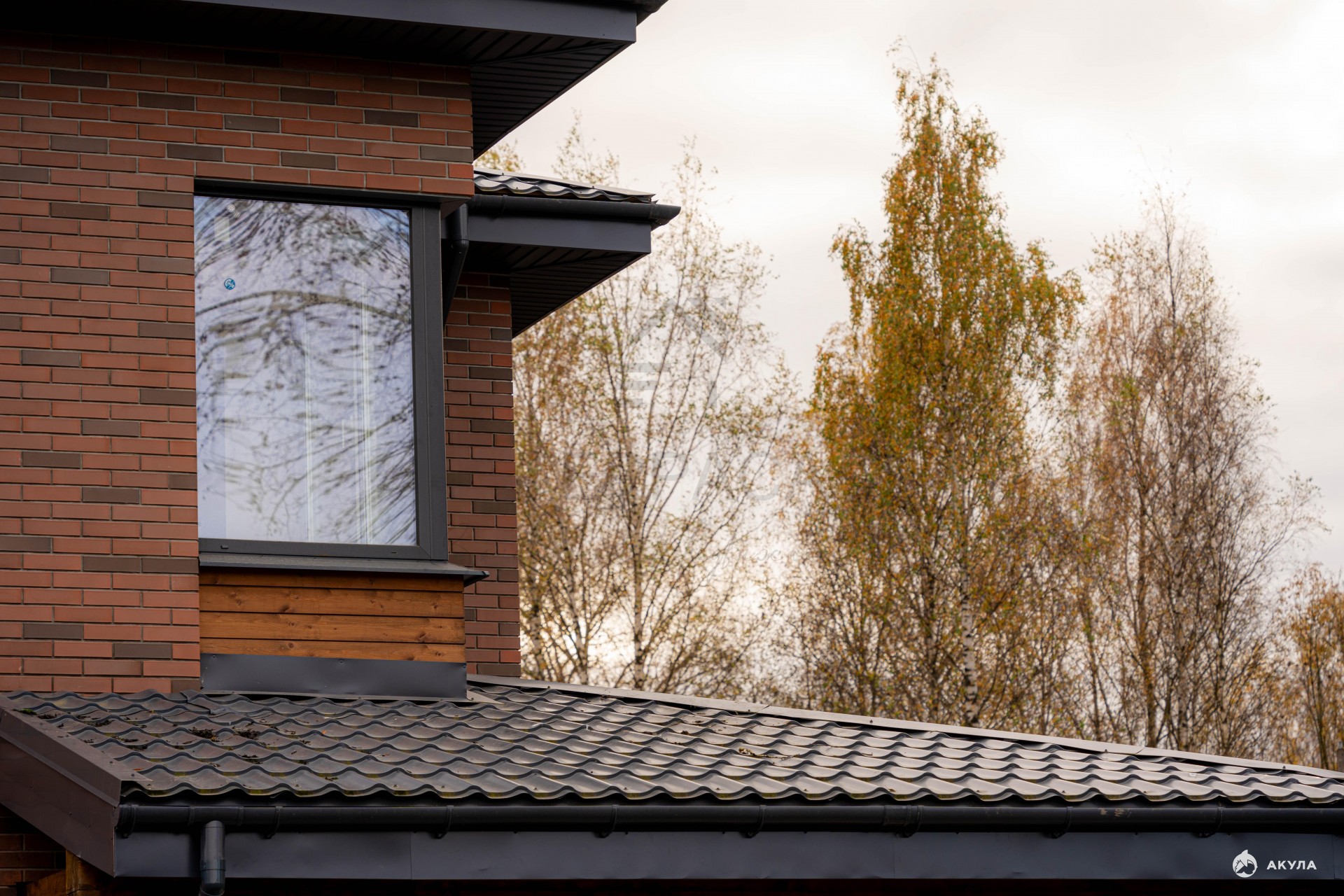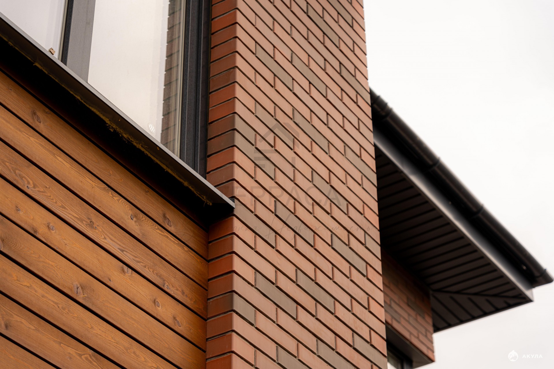 Фасад отделан облицовочным кирпичом и планкеном.