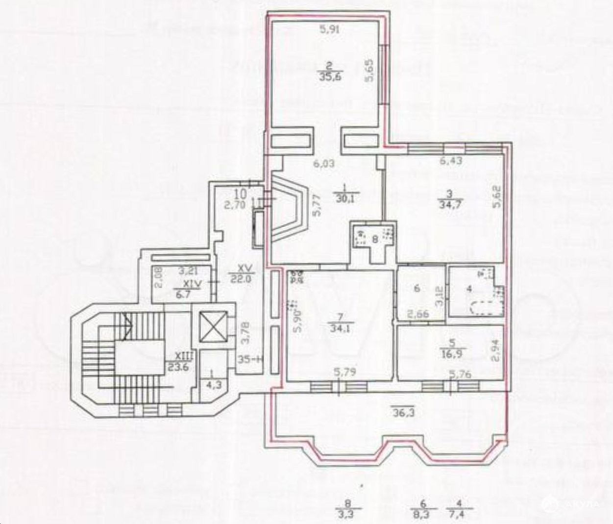 Квартира находится на 5 этаже 6-этажного дома (2006 года постройки). Планировка трехсторонняя, включает просторный холл, две спальни (35.6 м² и 34.7 м²) с окнами во двор (восток/юг), кухню (34.1 м²) и еще одну спальню (16.9 м²) с выходом на лоджию (запад).