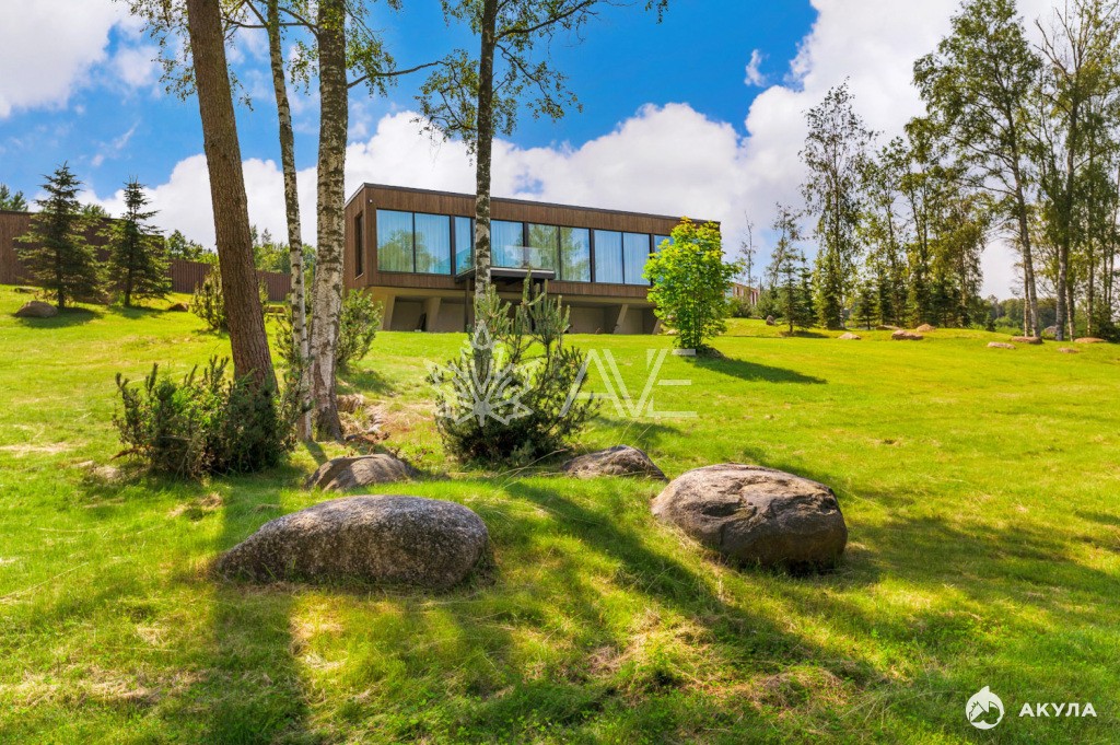 Дом площадью 315 кв.м расположен на участке 80 соток с ландшафтным дизайном, занимает самую высокую точку участка и открывает панорамные виды на Вуоксу и окружающую природу.