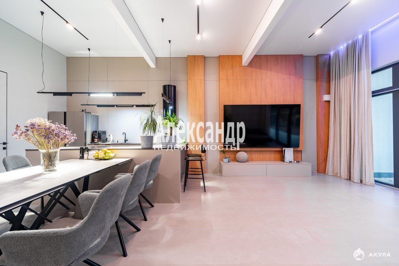 Просторная кухня-гостиная с панорамными окнами и выходом на террасу
