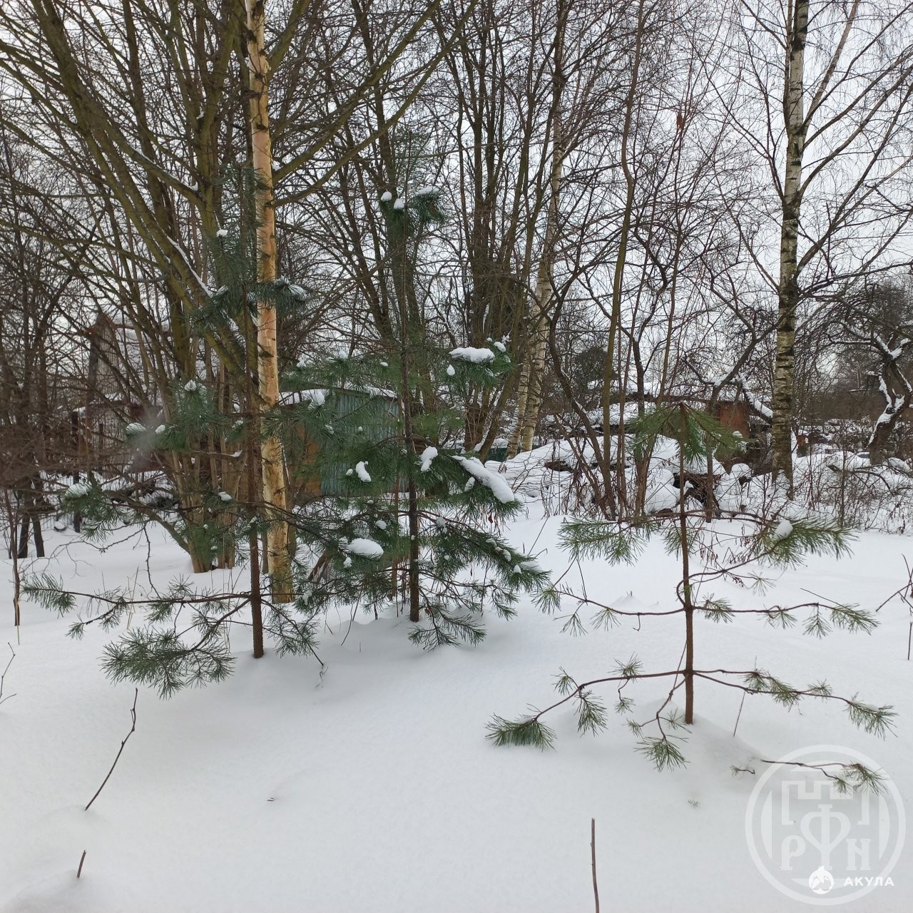 Участок ровный правильной формы, есть ворота, залит фундамент под гараж или навес для машин. На участке растут плодовые деревья, кустарники и новогодняя ель, которую можно украсить на зимние праздники.