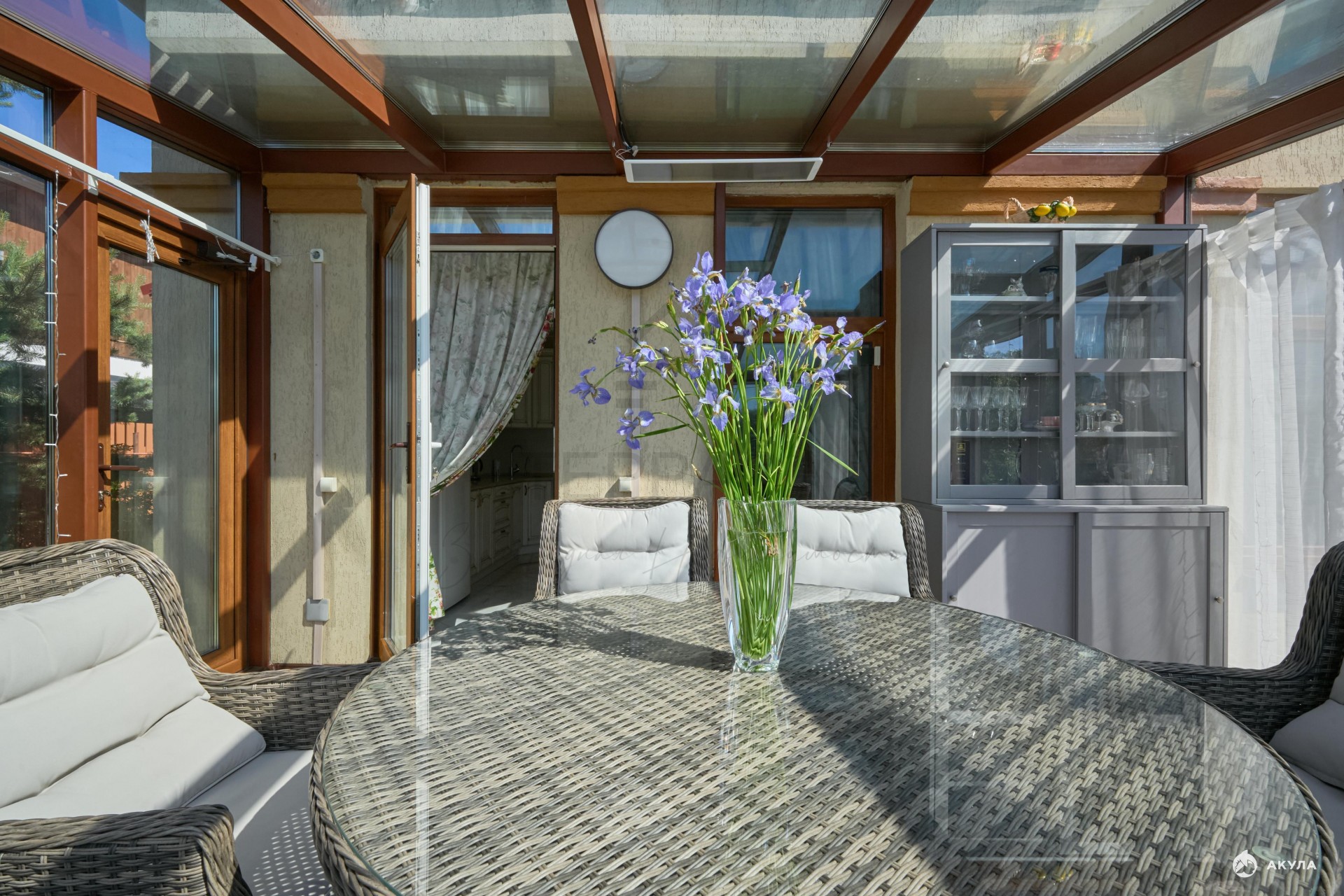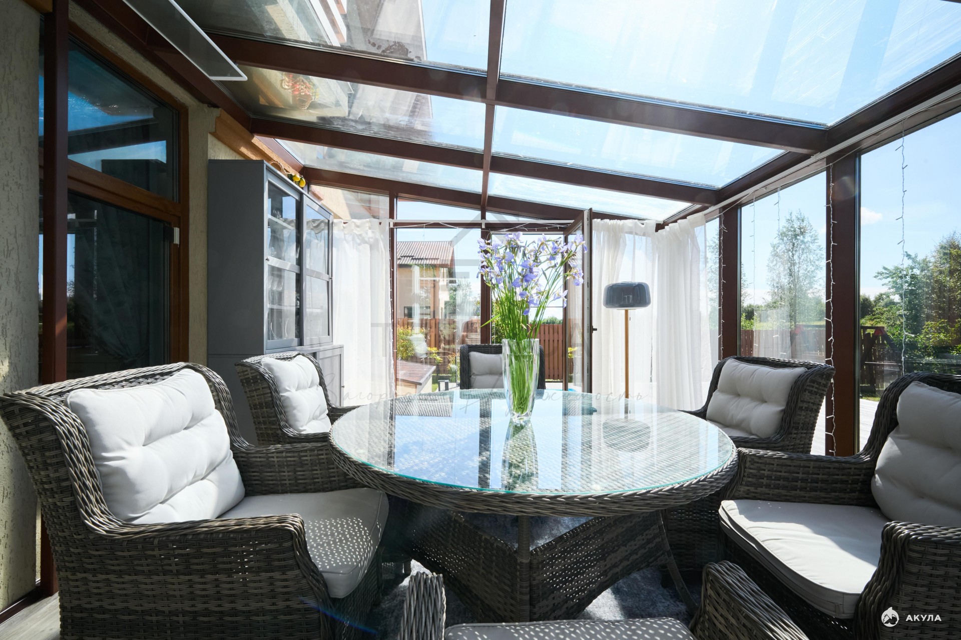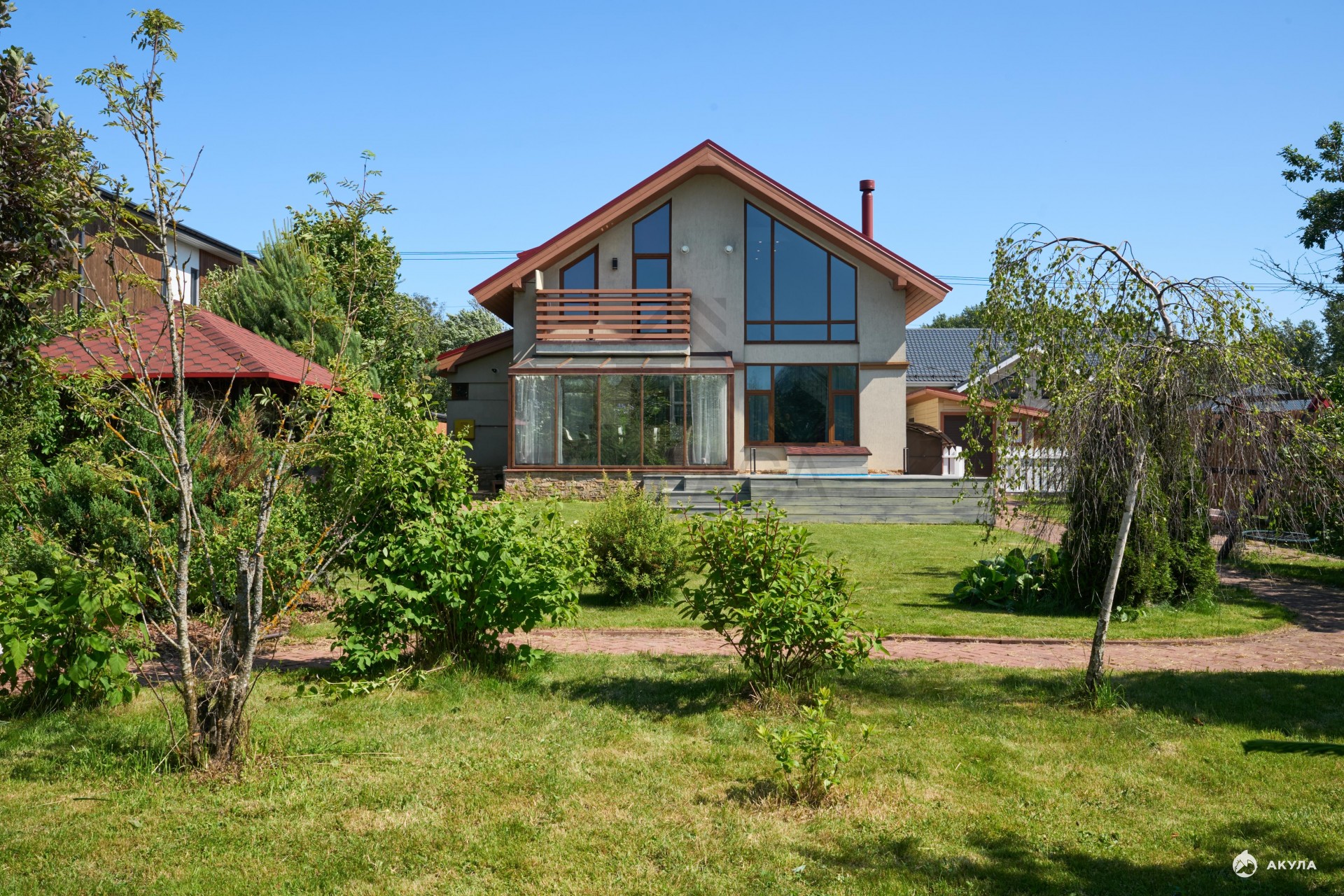 В доме светло и уютно . А за счет второго света и панорамного вида на цветущий сад чувствуется простор и единение с природой.