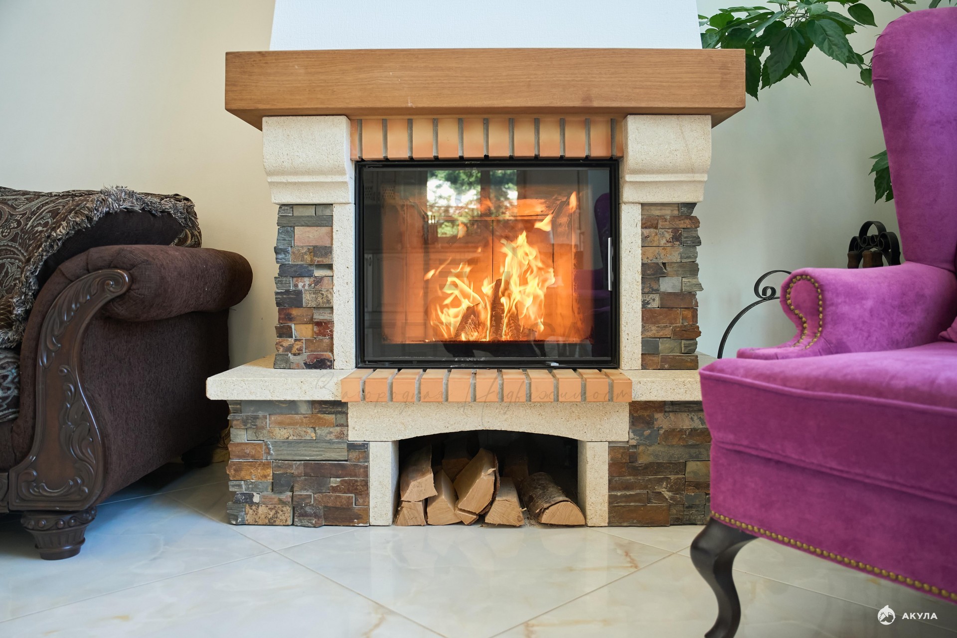 - Камин на дровах , отделан камнем .