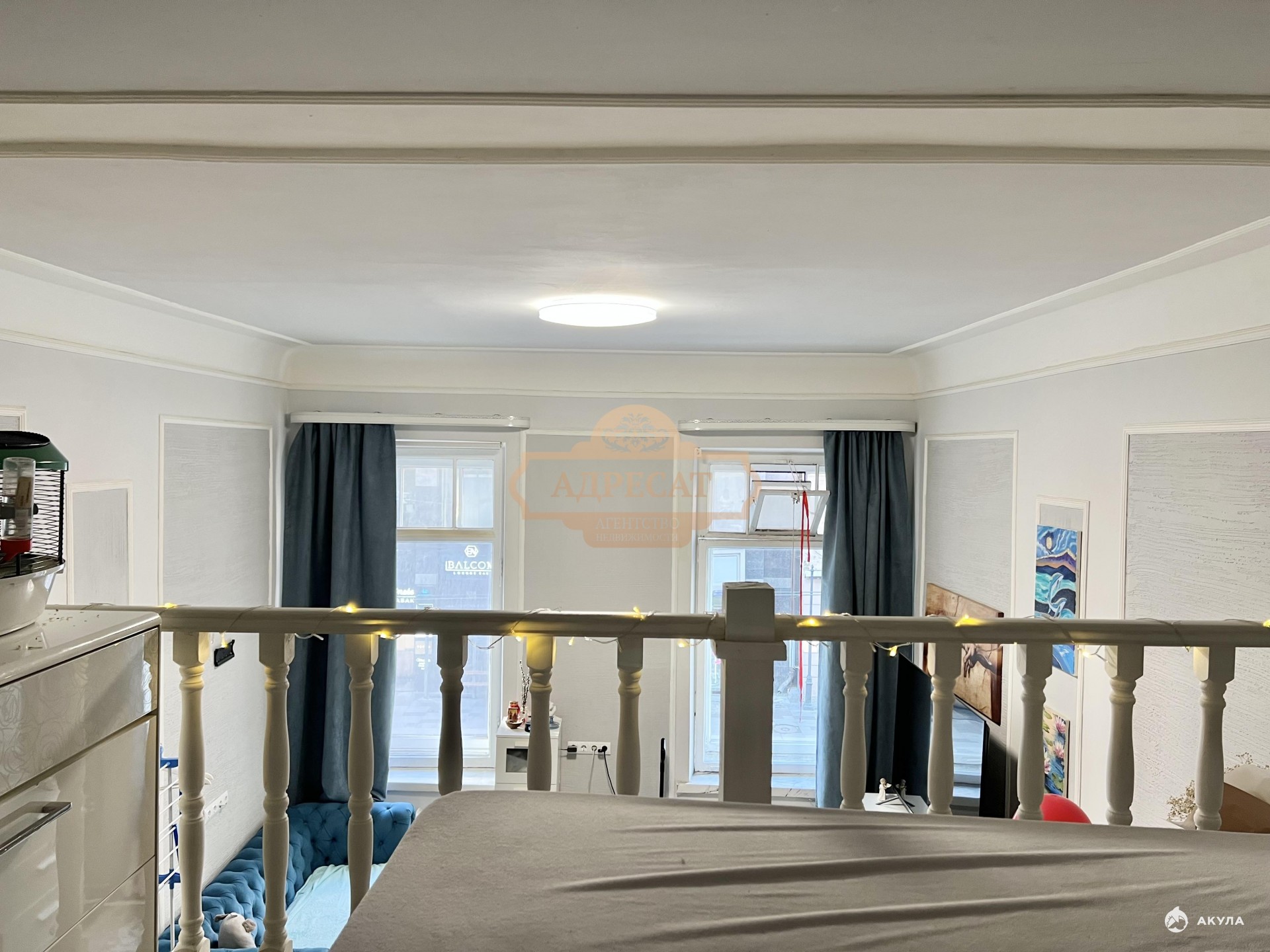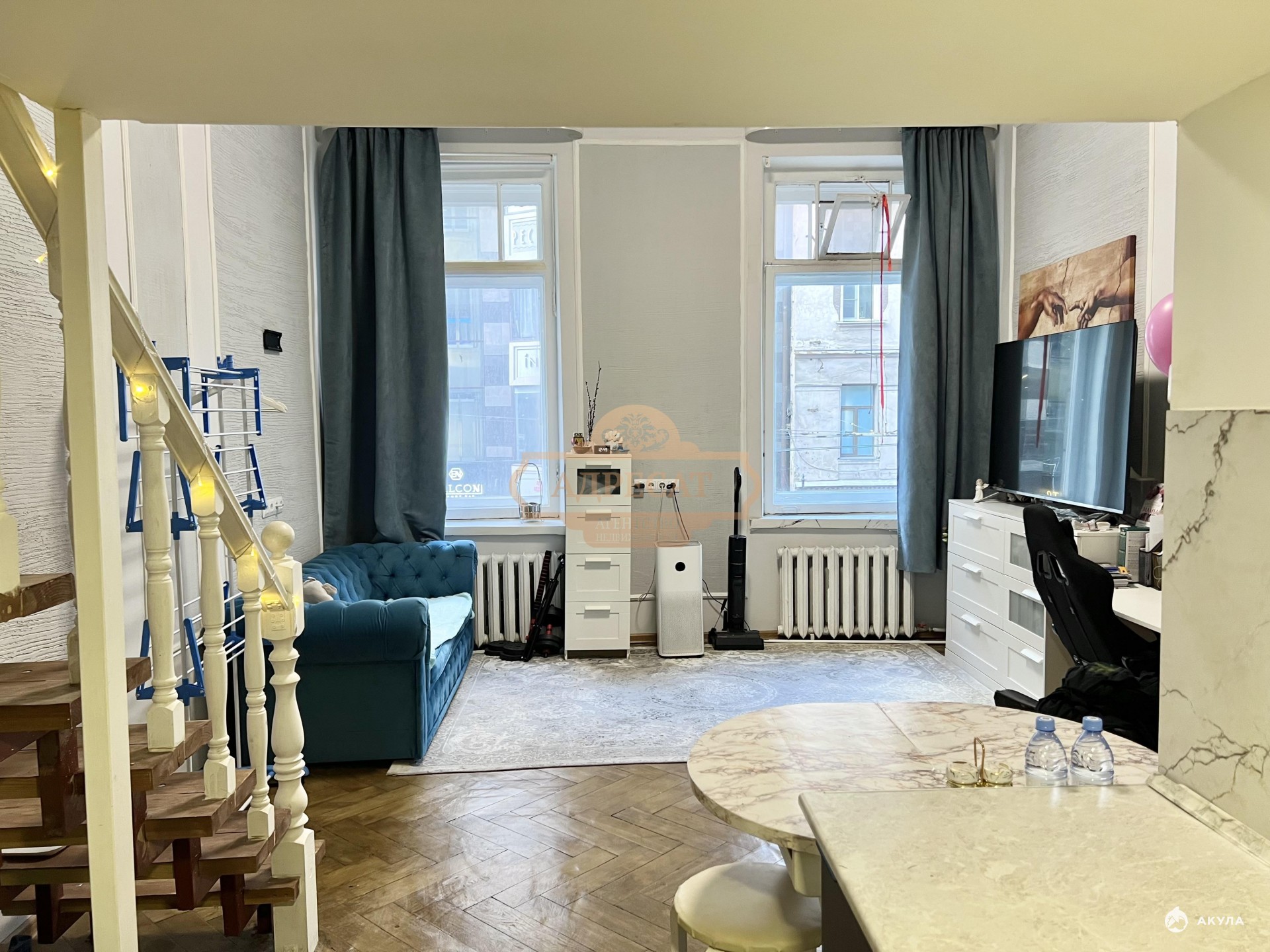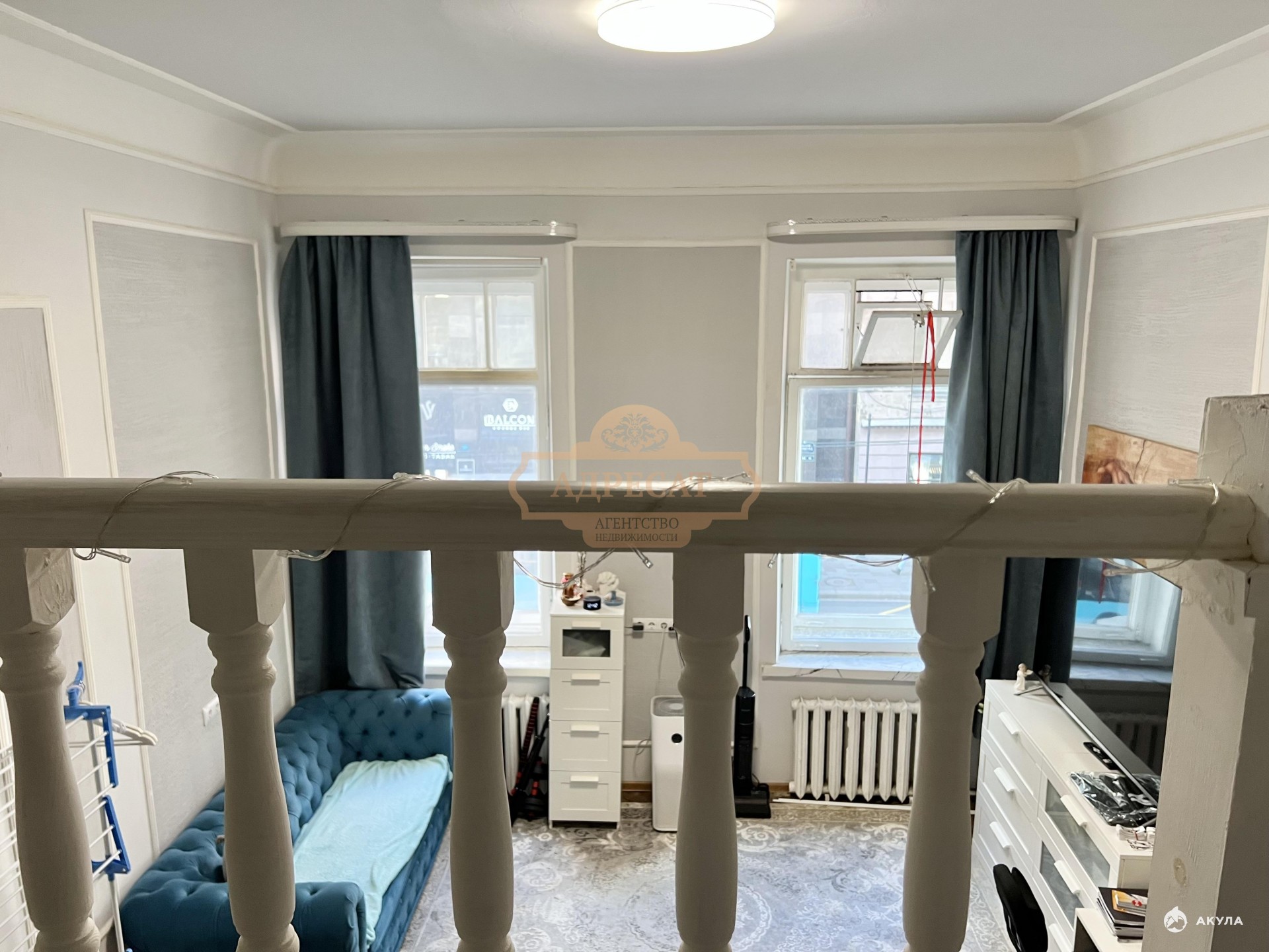 Комната находится на 2-ом этаже, с двумя большими окнами на Большой проспект, площадь комнаты 29.4 м2, плюс второй узаконенный ярус 8 м2, высота потолков 3, 80 м, высота второго яруса 1, 70 м.