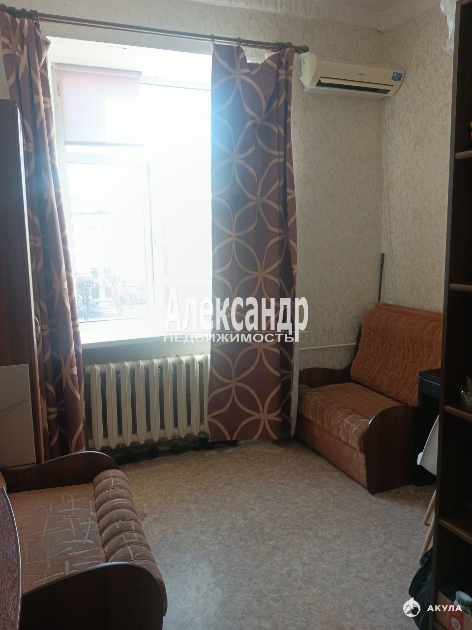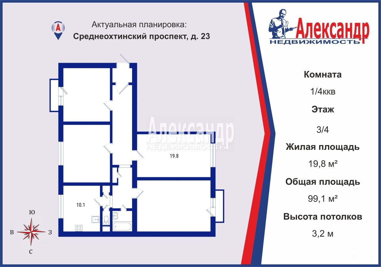 Комната 19, 8 кв.м, расположена в четырехкомнатной, двусторонней квартире, общей площадью 99, 1 кв.м, , окном на проспект. Помещение с косметическим ремонтом. Пластиковое окно в двухкамерным стеклопакетом. На полу линолеум. Высота потолков 3, 2 м.
