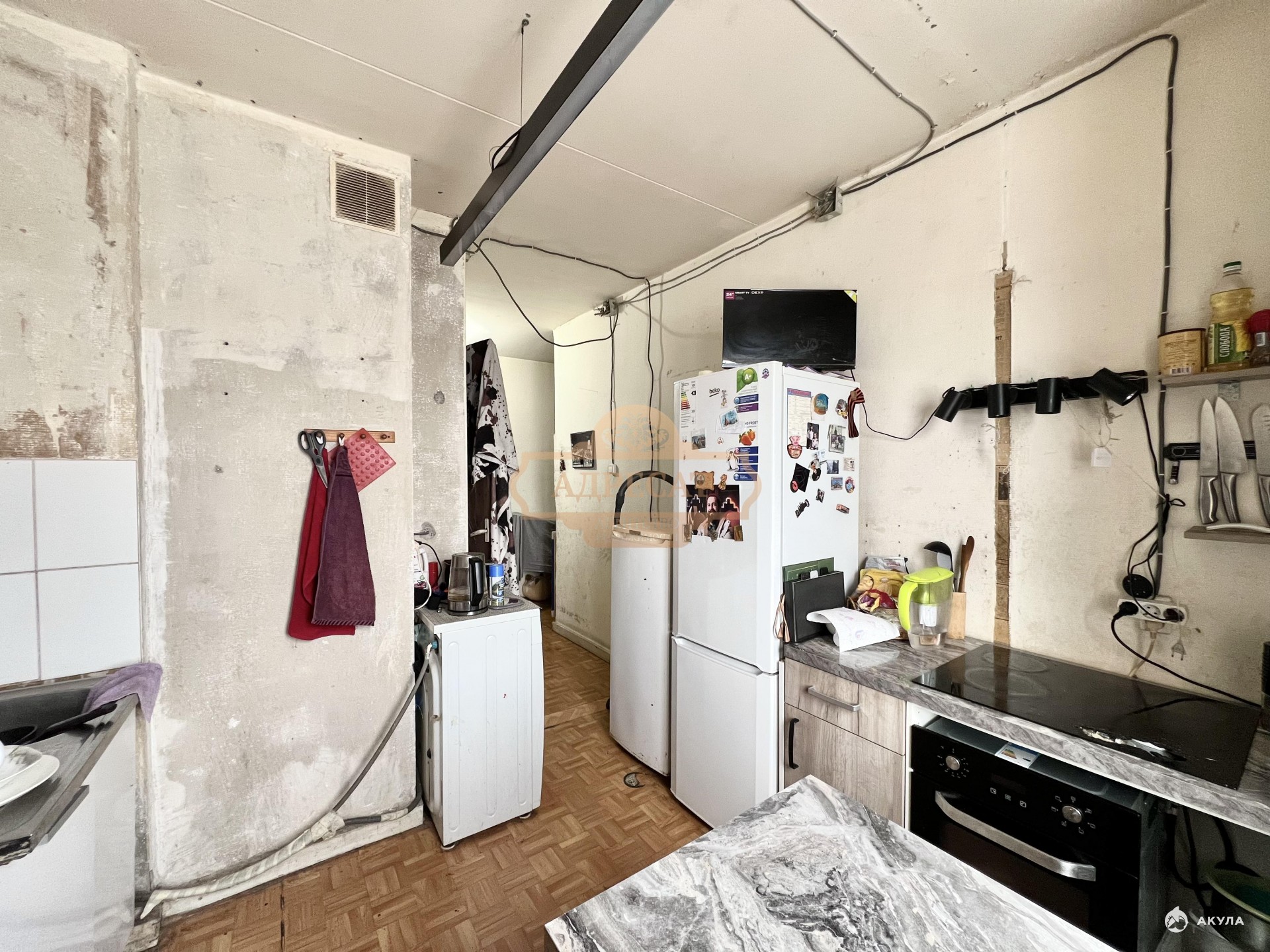Ванная комната в кафельной плитке, в санузле новый унитаз. Коридор и кухня требует ремонта, начали делать косметику, но на данный момент процесс стоит на паузе.