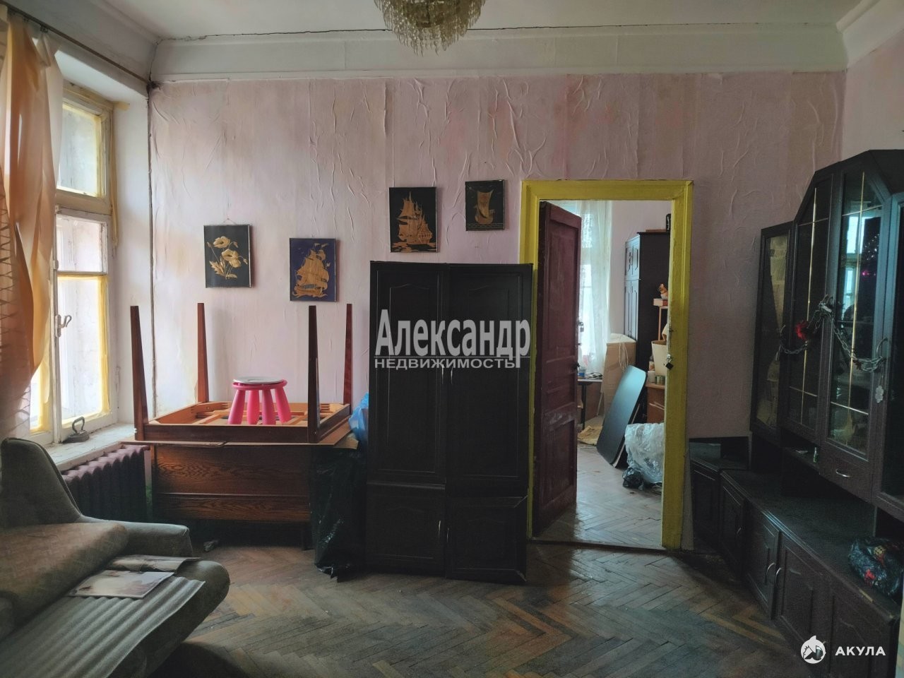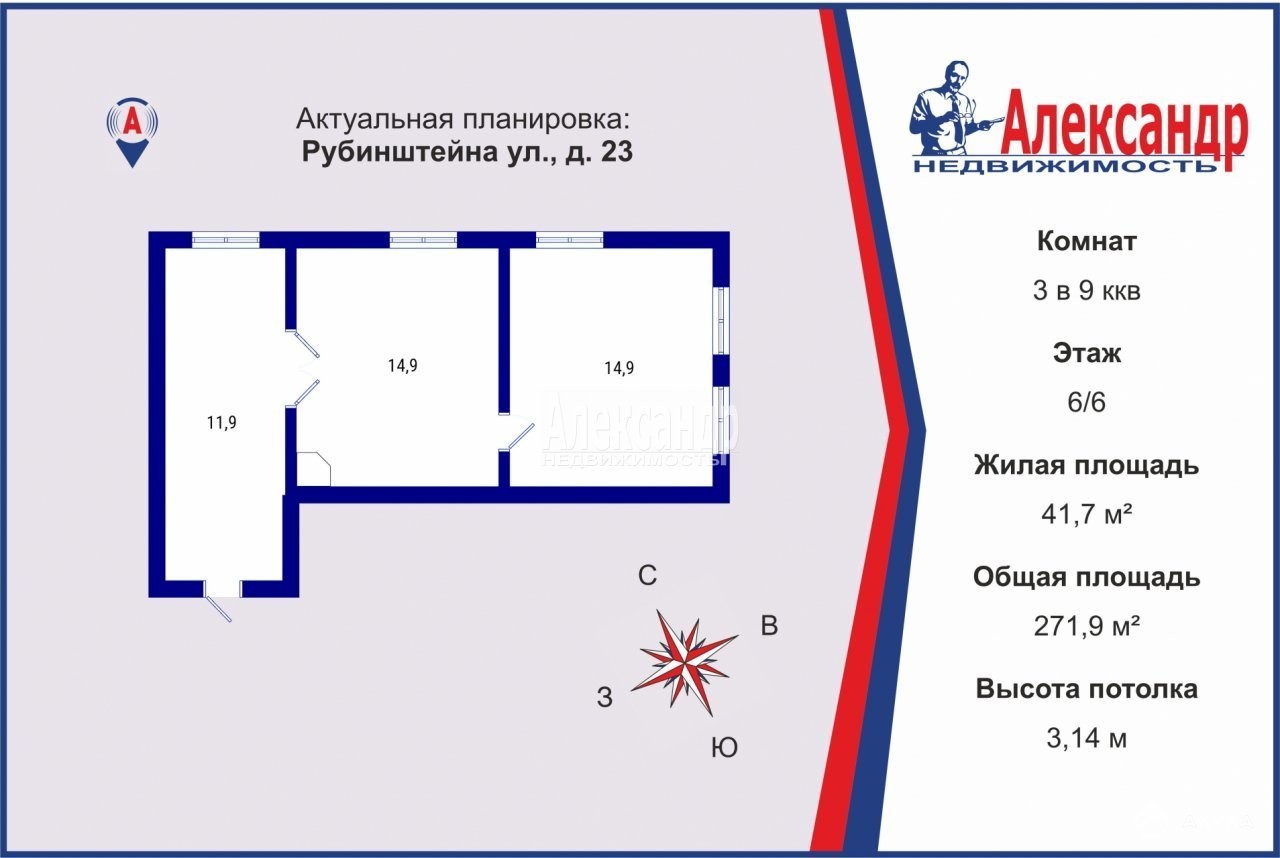 Три комнаты между собой сугубо-смежные, окна выходят на ул. Рубинштейна и во двор, с высокими потолками, большими окнами, оригинальными декоративными элементами и паркетным полом.