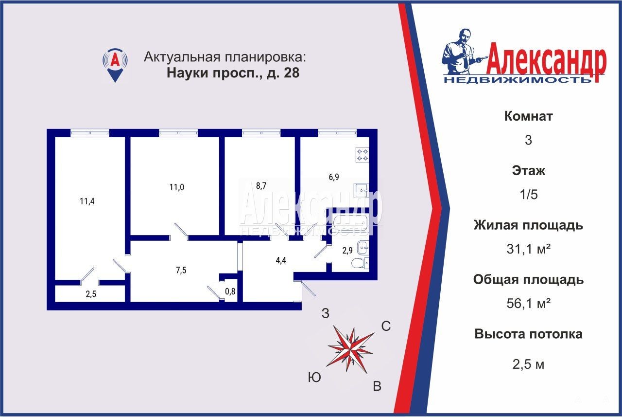 -3 изолированные комнаты (11, 4 м², 8, 7 м², 11 м²);